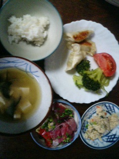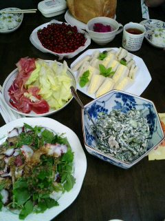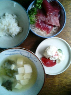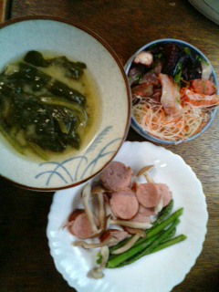 【夕食】刺身。アスパラガス、マエタケ、ソーセージを茹でる。ほうれん草の味噌汁