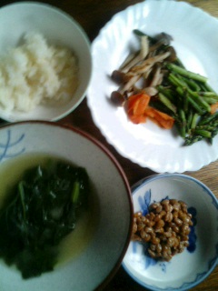 【朝食】納豆。炒め物(アスパラガス、マエタケ、人参)。ご飯。ほうれん草の味噌汁