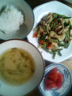 【朝食】アスパラガス、キャベツ、人参、たまねぎの炒め物。トマト。納豆。ご飯。ほうれん草の味噌汁。